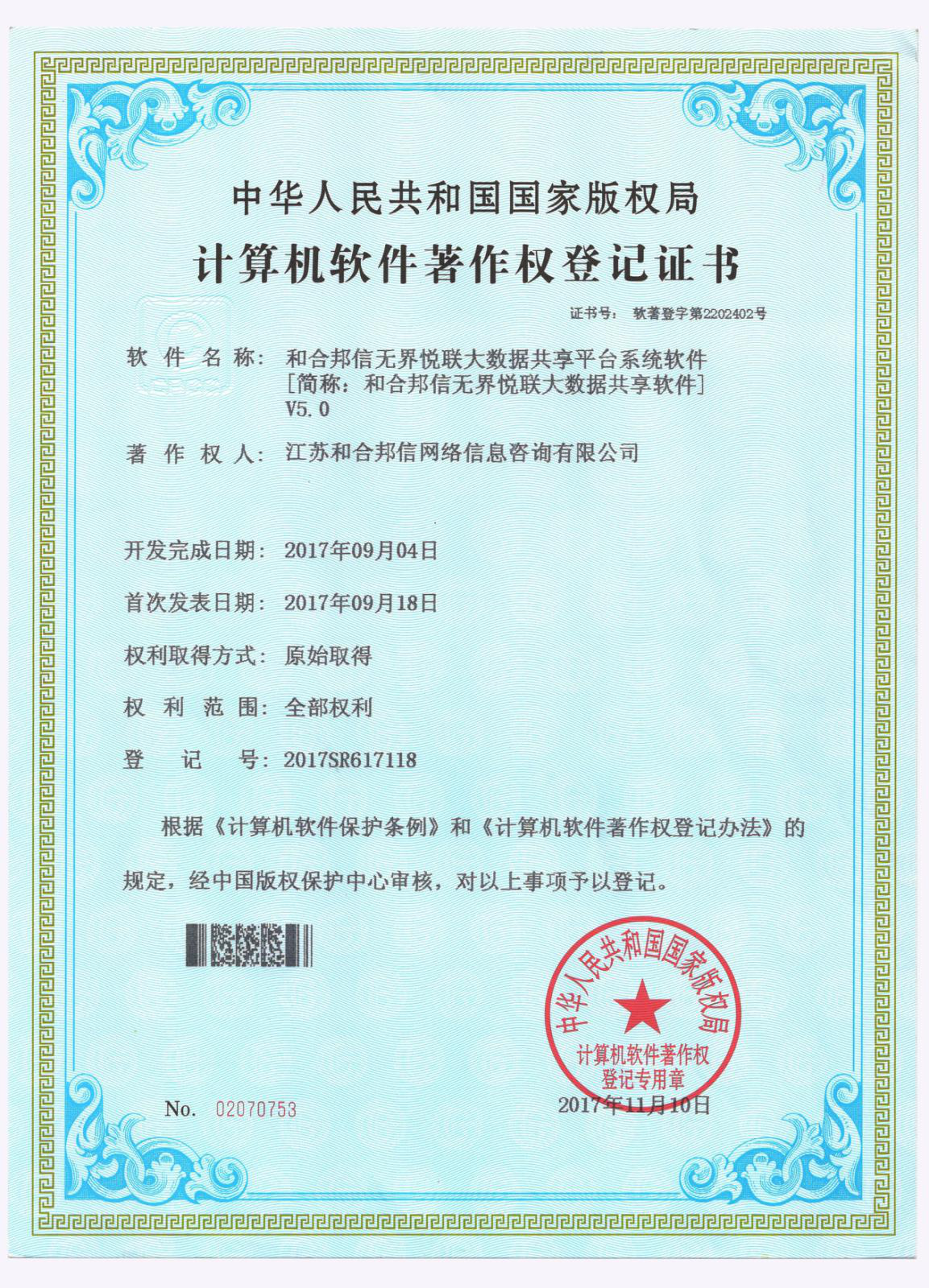 和合邦信无界悦联大数据共享平台系统软件荣获国家计算机软件著作权证书